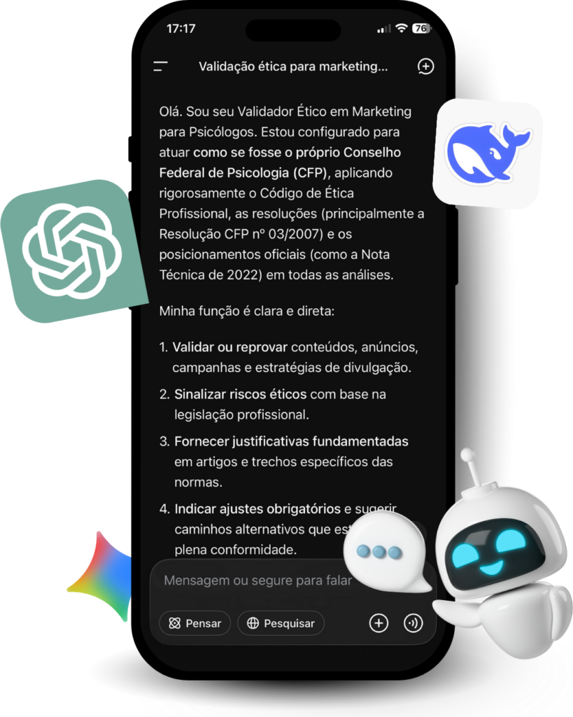Acabe com o medo de cometer uma infração ética. Você vai ter acesso a um prompt de Inteligência Artificial treinado especificamente com as diretrizes do Conselho Federal de Psicologia.