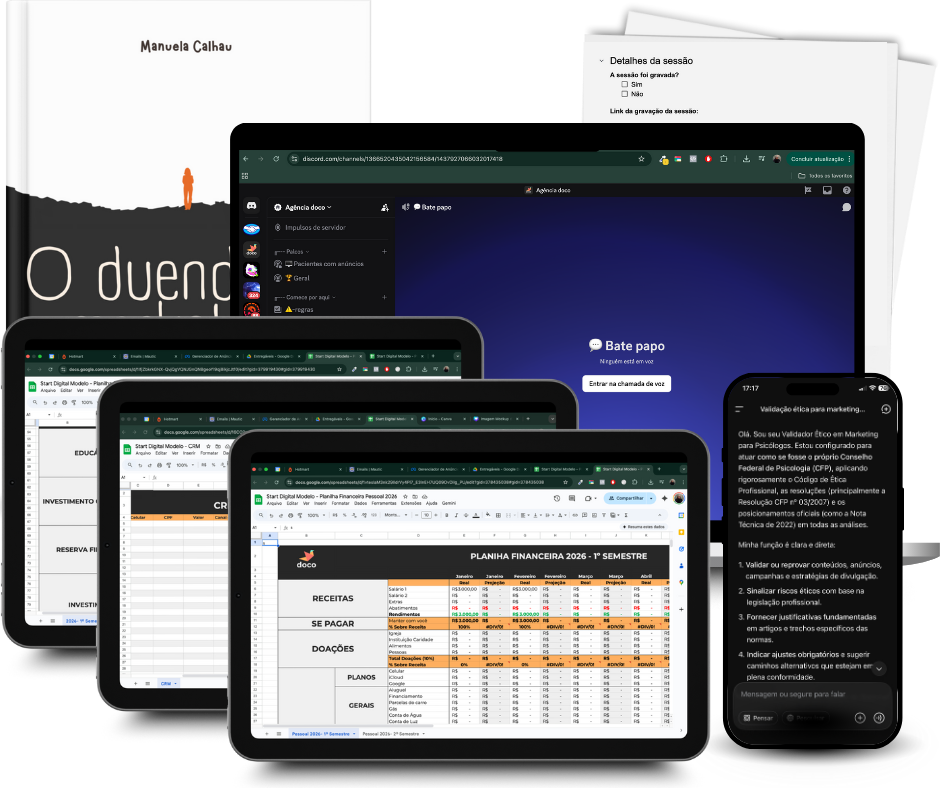 Garanta o seu “Kit Psicólogo Digital”: o único pacote que une a gestão financeira pessoal e profissional, uma IA para auxílio ético e o método para colocar seu consultório no topo das pesquisas do Google antes de todos os seus concorrentes.